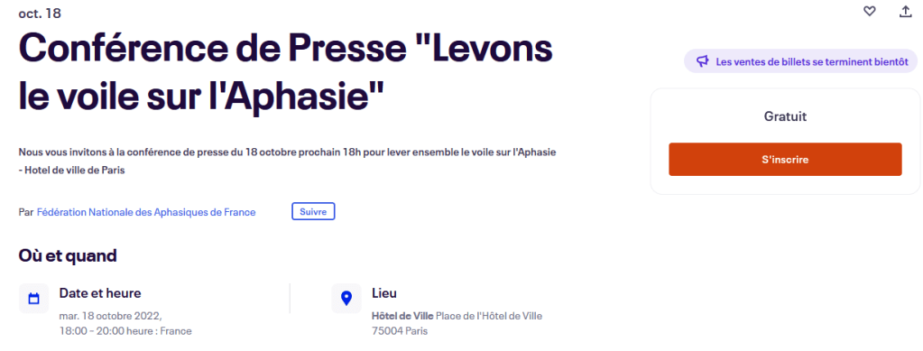 En présentiel ou sur internet (Zoom) Mardi 18 octobre 2022 à 18h ! Site : https://www.eventbrite.fr/e/billets-conference-de-presse-levons-le-voile-sur-laphasie-438976680067?lang=fr-fr&locale=fr_FR&status=30&view=listing Partager : Partager sur X(ouvre dans une nouvelle fenêtre) X Partager sur Facebook(ouvre dans une nouvelle fenêtre) Facebook J’aime chargement… Similaire Publié par Dom Chufere Voir tous les articles par Dom Chufere