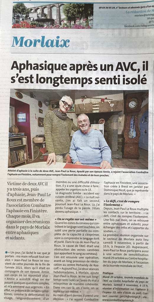 Le Télégramme, le 25 octobre 2024. Jean-Paul est le vice-président de Combattre l’aphasie en Finistère ! Partager : Partager sur X(ouvre dans une nouvelle fenêtre) X Partager sur Facebook(ouvre dans une nouvelle fenêtre) Facebook J’aime chargement… Similaire Publié par Dom Chufere Voir tous les articles par Dom Chufere